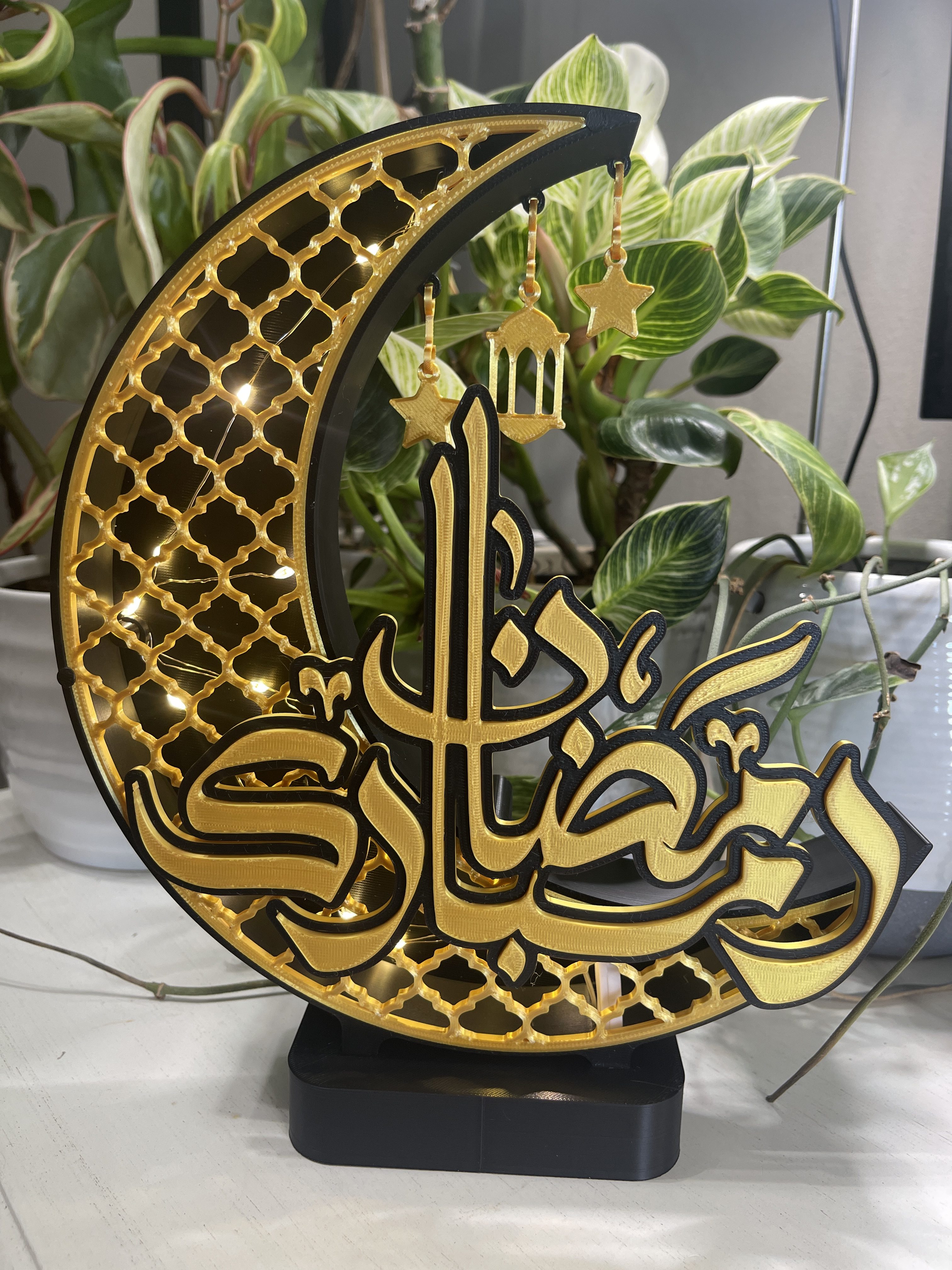 Ramadan Mubarak table decoration with light.